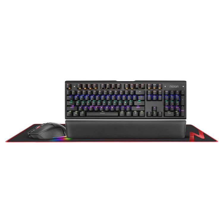 Contiene Teclado Mecánico y Mouse Retroiluminados, Mouse Pad XL que soporta todo el Combo y una Almohadilla Reposa-Muñecas sumamente acolchada para un óptimo confort.